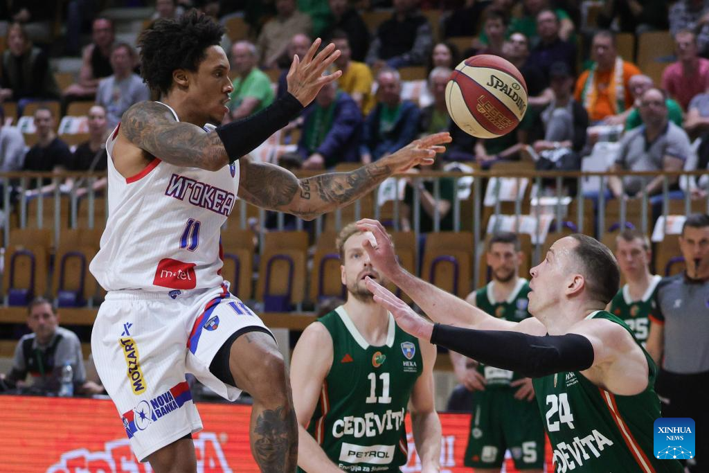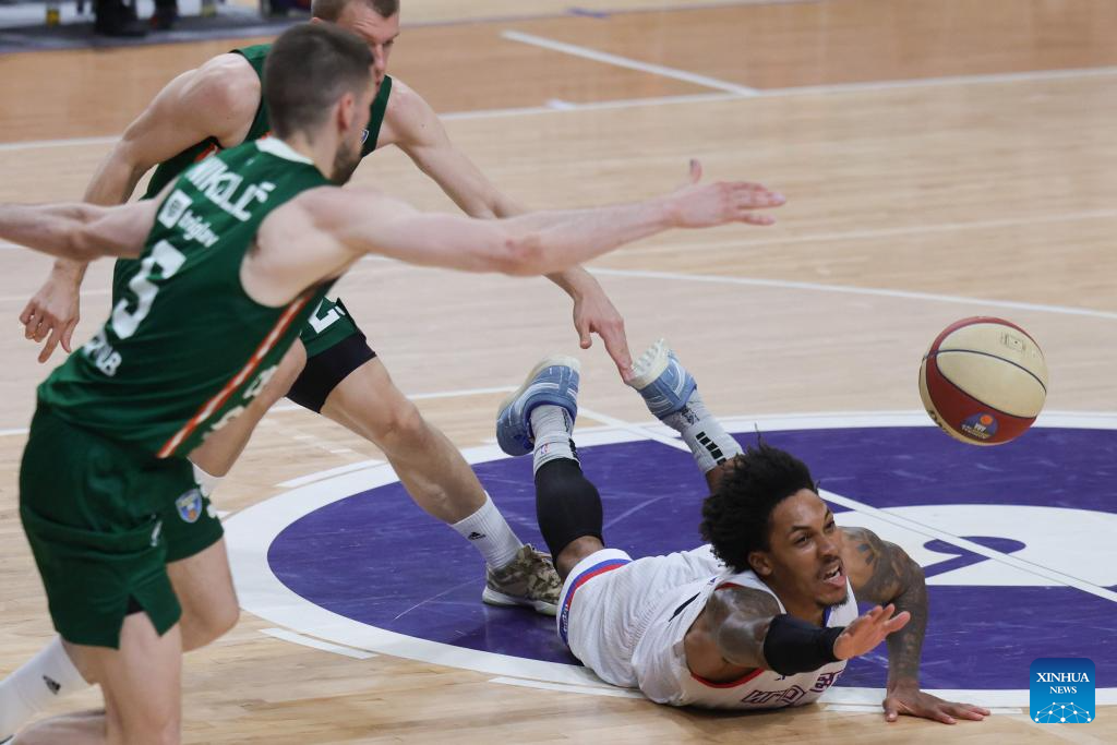 Nathaniel Amir Pierre-Louis (R) of Igokea M:Tel competes during an ABA Basketball League match between Cedevita Olimpija and Igokea M:Tel in Ljubljana, Slovenia, April 19, 2026. (Photo by Zeljko Stevanic/Xinhua)