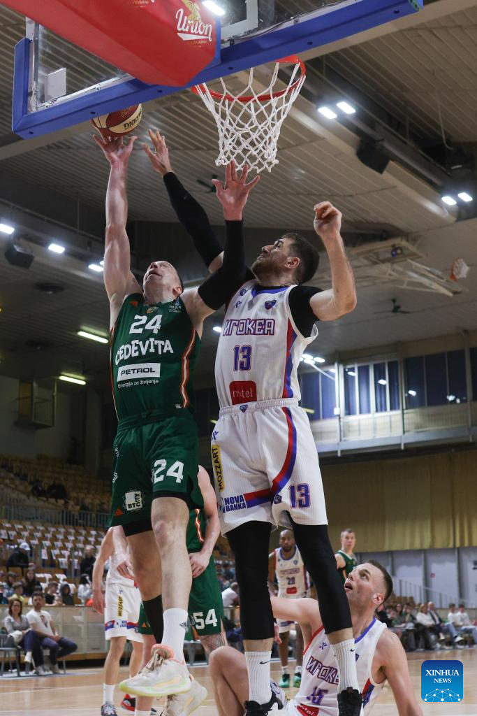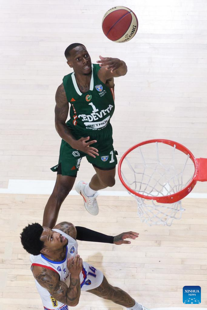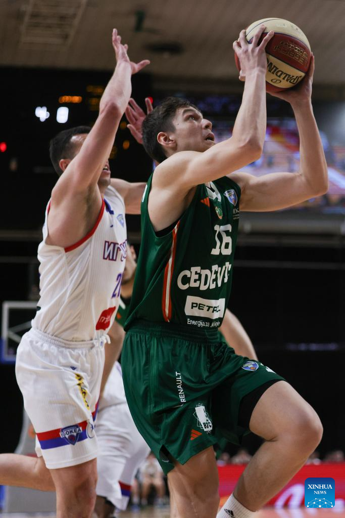 Derin Can Ustun (R) of Cedevita Olimpija goes for a layup during an ABA Basketball League match between Cedevita Olimpija and Igokea M:Tel in Ljubljana, Slovenia, April 19, 2026. (Photo by Zeljko Stevanic/Xinhua)