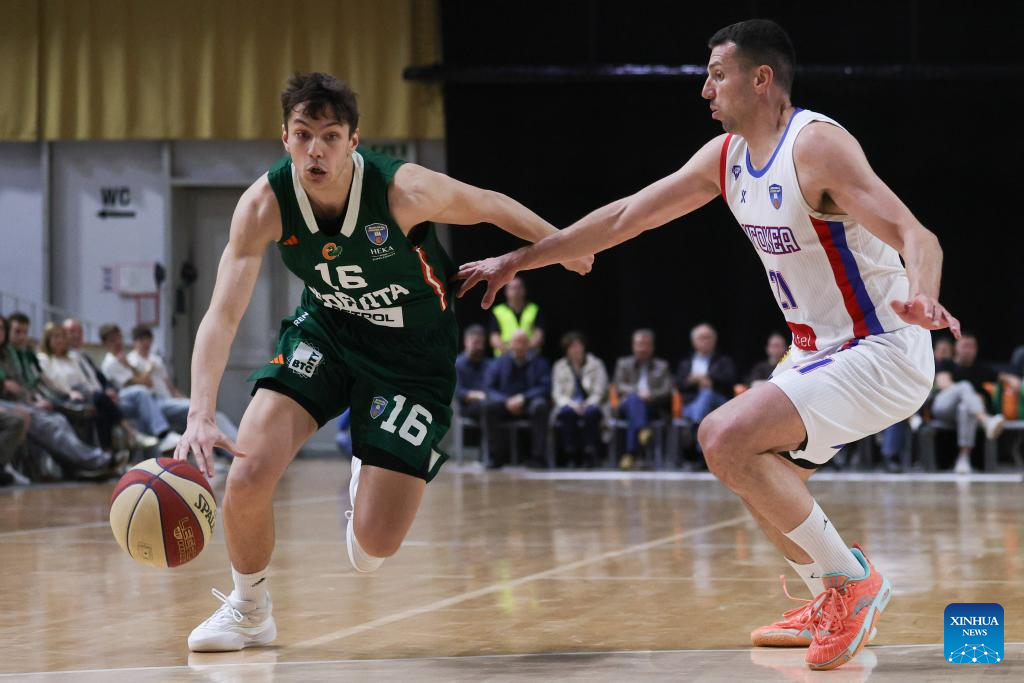 Novak Music (L) of Igokea M:Tel vies with Ognjen Jaramaz of Cedevita Olimpija during an ABA Basketball League match between Cedevita Olimpija and Igokea M:Tel in Ljubljana, Slovenia, April 19, 2026. (Photo by Zeljko Stevanic/Xinhua)