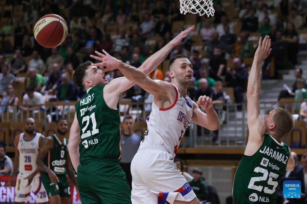 David Skara (top L) of Cedevita Olimpija vies with Aleksandar Lazic (top R) of Igokea M:Tel during an ABA Basketball League match between Cedevita Olimpija and Igokea M:Tel in Ljubljana, Slovenia, April 19, 2026. (Photo by Zeljko Stevanic/Xinhua)
