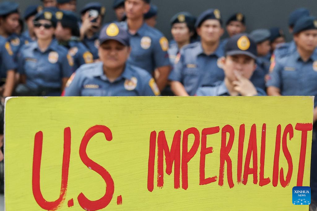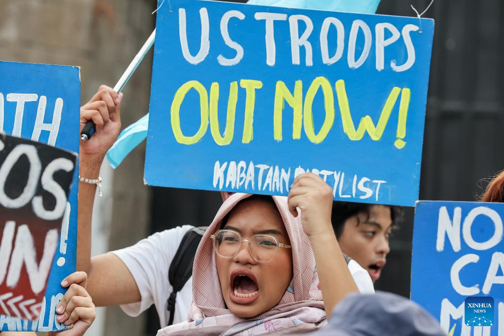 Filipino protesters held a rally outside the headquarters of the Armed Forces of the Philippines on Monday morning, holding placards reading "Stop Balikatan,""Pull out U.S. troops and missiles," and "U.S. imperialist No.1 Terrorist." (Xinhua/Rouelle Umali)