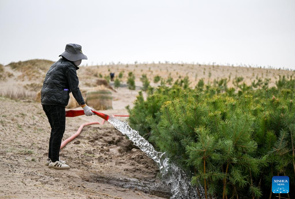A worker irrigates trees at an anti-desertification project area in Horqin Left Wing Rear Banner of Tongliao City, north China's Inner Mongolia Autonomous Region, April 19, 2026. The sandy area of this project is nearly 3,000 mu (200 hectares), which is the last mobile and semi-mobile sandy land to be treated in Horqin Left Rear Banner. (Xinhua/Lian Zhen)