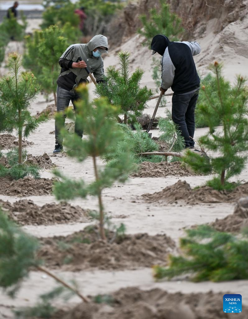 Workers plant trees at an anti-desertification project area in Horqin Left Wing Rear Banner of Tongliao City, north China's Inner Mongolia Autonomous Region, April 19, 2026. The sandy area of this project is nearly 3,000 mu (200 hectares), which is the last mobile and semi-mobile sandy land to be treated in Horqin Left Rear Banner. (Xinhua/Lian Zhen)