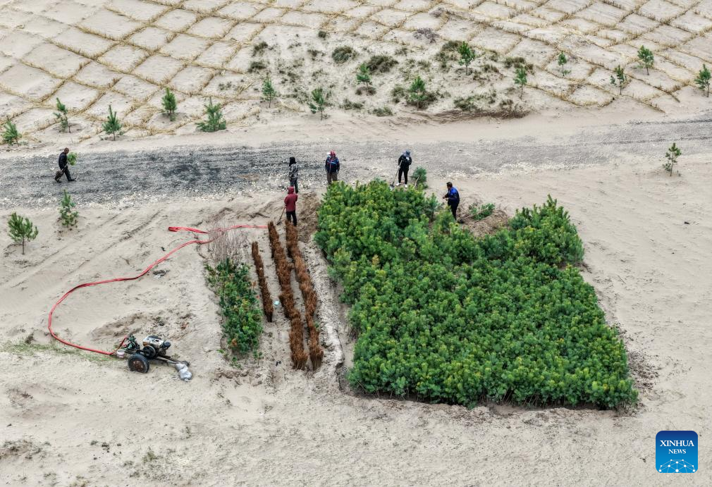 An aerial drone photo taken on April 19, 2026 shows workers planting trees at an anti-desertification project area in Horqin Left Wing Rear Banner of Tongliao City, north China's Inner Mongolia Autonomous Region. The sandy area of this project is nearly 3,000 mu (200 hectares), which is the last mobile and semi-mobile sandy land to be treated in Horqin Left Rear Banner. (Xinhua/Lian Zhen)