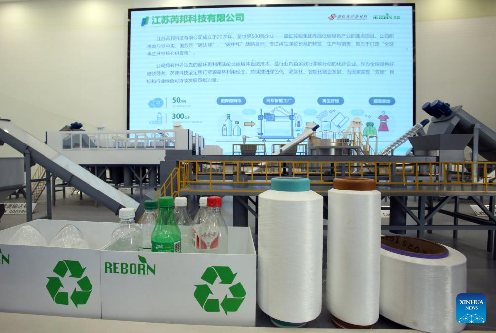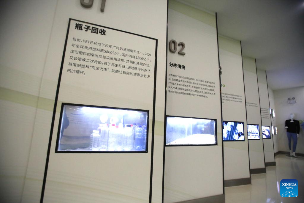 Exhibition boards displaying the process of recycling plastic bottles to make clothes are pictured at Ruibang Technology Co., Ltd. in Siyang County of Suqian, east China's Jiangsu Province, March 26, 2026. Ruibang is a world-leading manufacturer of recycled polyester filaments and is active in implementing zero-carbon actions in the industry.