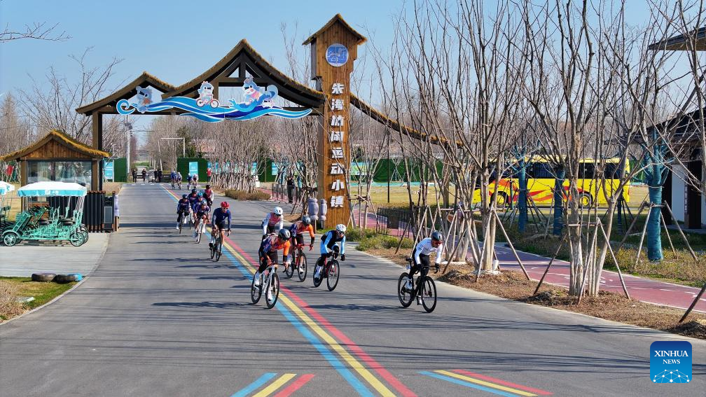People ride bicycles at Zhuhai sports town in Wangguanji Town of Suqian, east China's Jiangsu Province, March 16, 2025. The sports town is an eco-tourism project built upon local water environment restoration. In 2020, a comprehensive water environment improvement project was initiated in Zhuhai to tackle the problem of aquaculture tailwater, connecting local water system and turning stagnant water into flowing water.