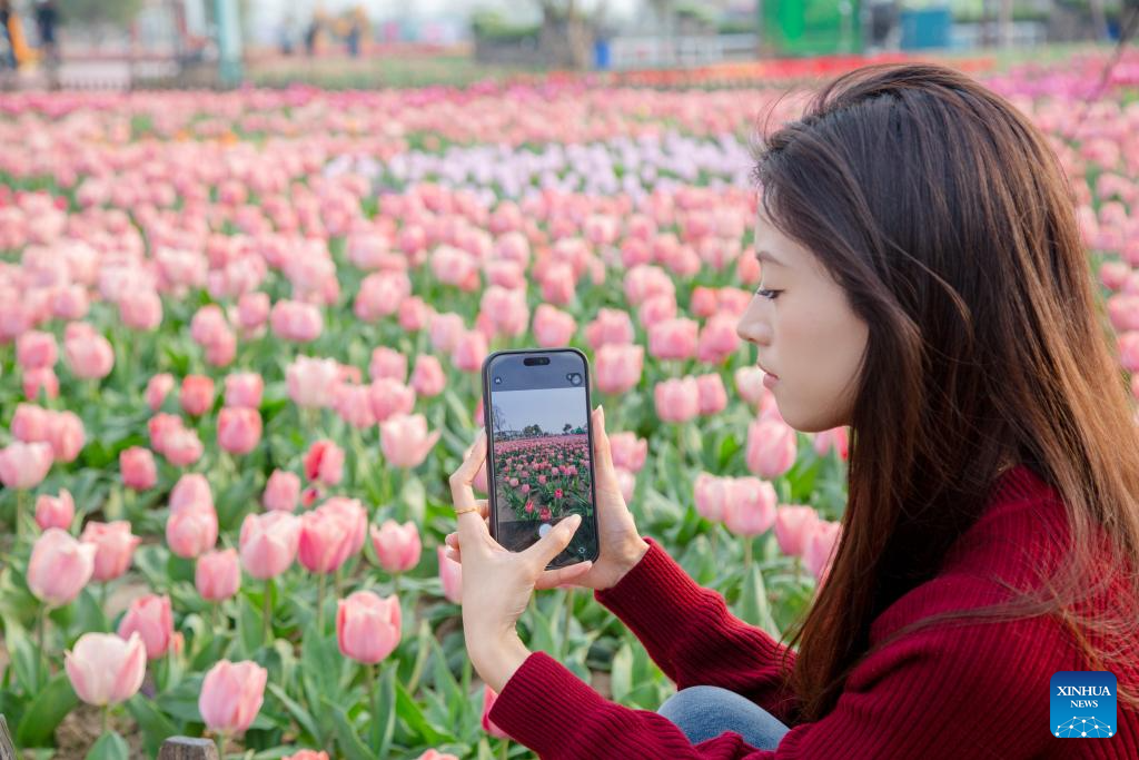 A tourist takes photos of blooming tulips at Holland flower park in Yancheng, east China's Jiangsu Province, March 29, 2026.