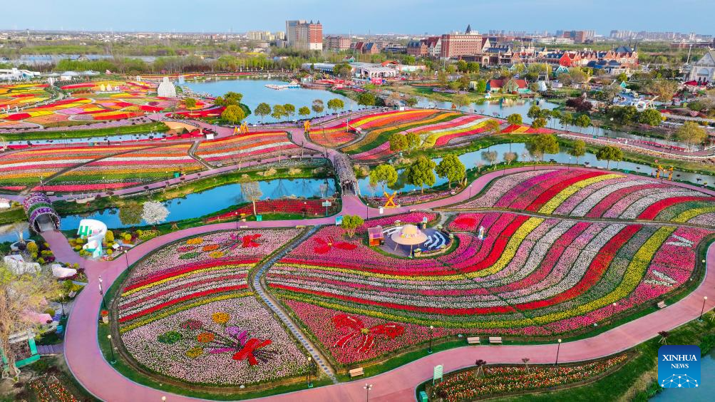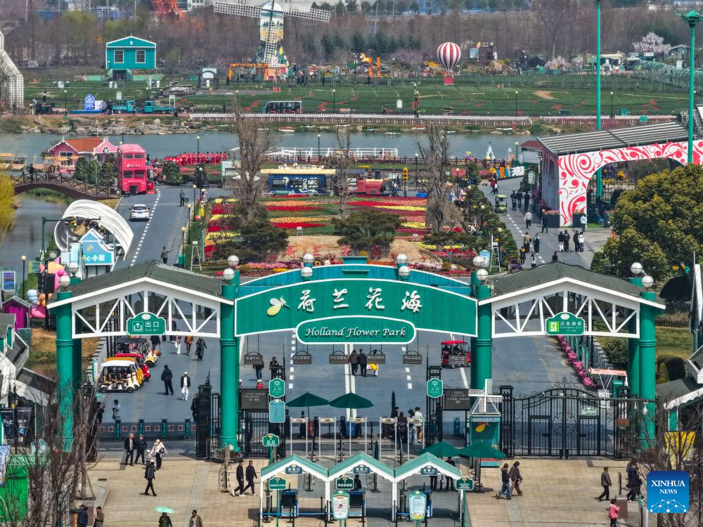 Tourists enjoy leisure time amid blooming flowers at Holland flower park in Yancheng, east China's Jiangsu Province, April 15, 2026.