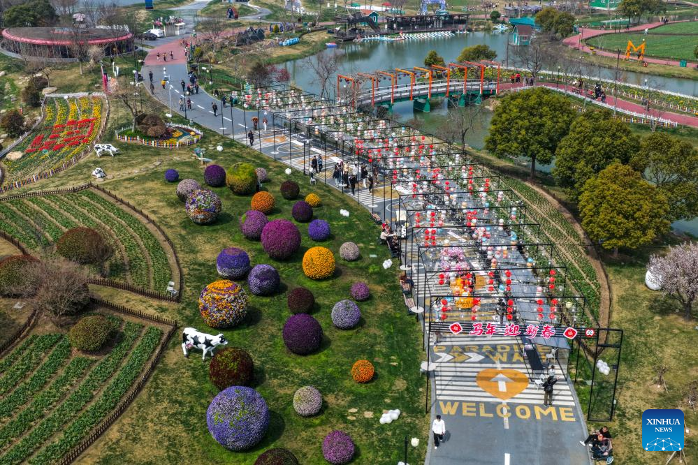 An aerial drone photo taken on March 26, 2026 shows tourists visiting Holland flower park in Yancheng, east China's Jiangsu Province.