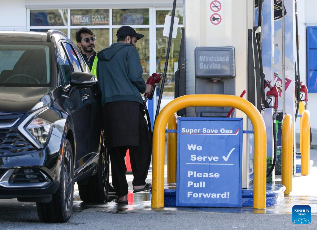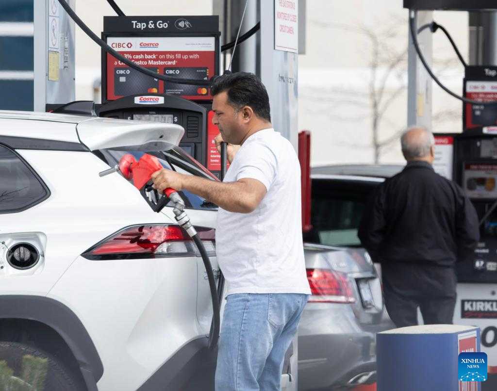 A man fuels his car at a gas station in Vancouver, British Columbia, Canada, on April 20, 2026. Canada's Consumer Price Index (CPI) increased 2.4 percent year over year in March, up from an increase of 1.8 percent in February, Statistics Canada said on Monday. (Photo by Liang Sen/Xinhua)