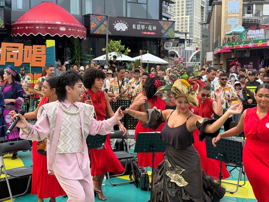 The scene unfolded in Nanning, capital of Guangxi Zhuang Autonomous Region in south China, where the Copacabana Fort Orchestra took part in a cultural exchange program during the "Sanyuesan" festival, a traditional ethnic and regional celebration known for its singing and communal gatherings.
