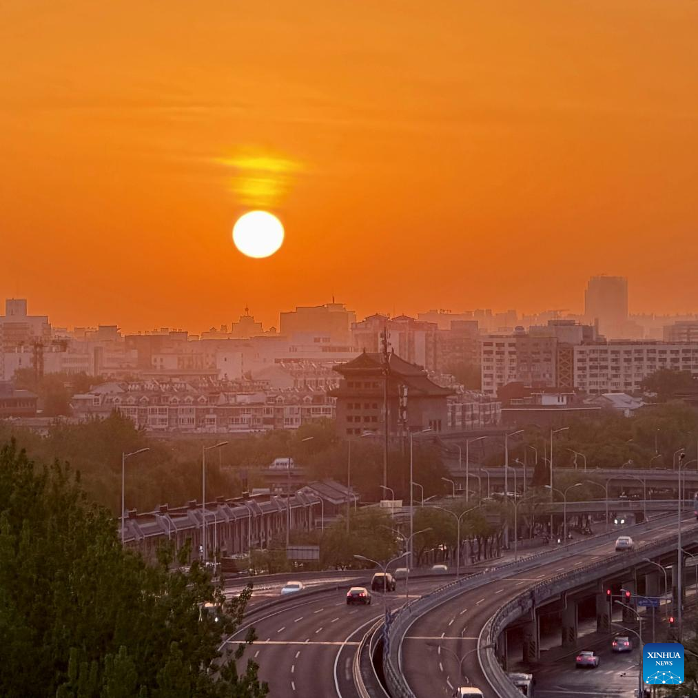 This photo taken on April 21, 2026 shows a view of the morning glow over Beijing, capital of China. (Xinhua/Xing Guangli)