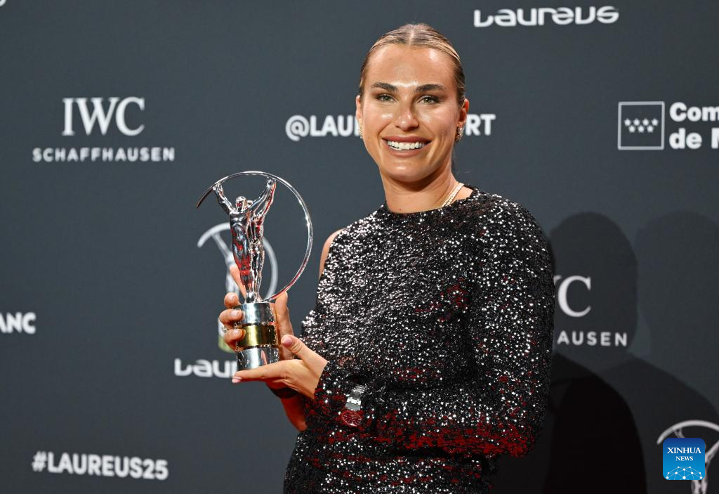 Aryna Sabalenka poses with the Laureus World Sportswoman of the Year Award during the 2026 Laureus World Sports Awards ceremony in Madrid, Spain, April 20, 2026. (Xinhua/Cheng Min)