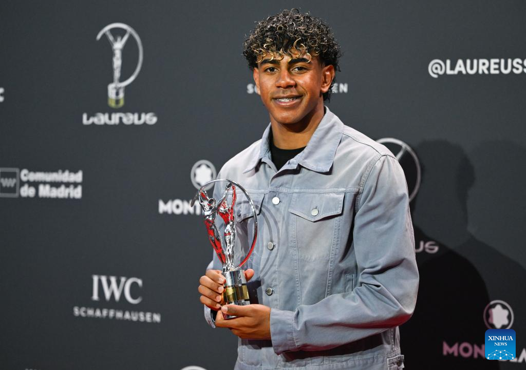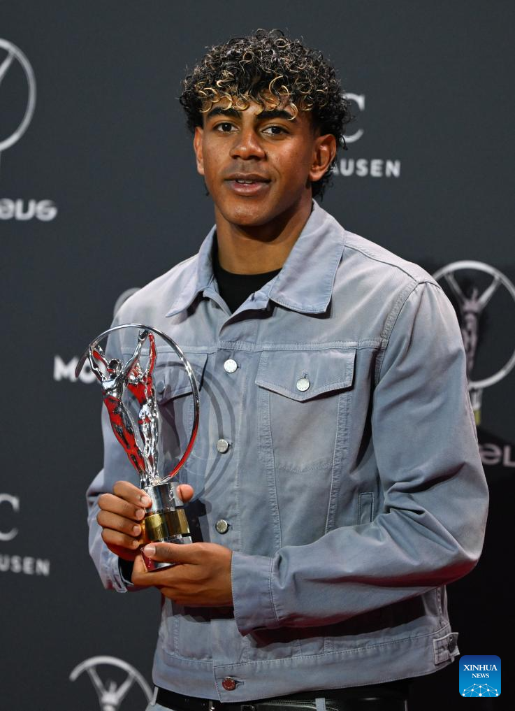 Lamine Yamal poses with Laureus World Young Sportsperson of the Year Award during the 2026 Laureus World Sports Awards ceremony in Madrid, Spain, April 20, 2026. (Xinhua/Cheng Min)