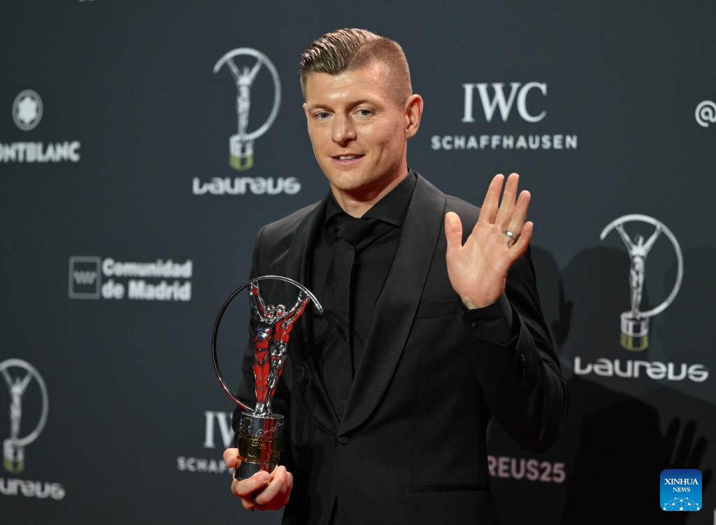 Toni Kroos poses with Laureus Sporting Inspiration Award during the 2026 Laureus World Sports Awards ceremony in Madrid, Spain, April 20, 2026. (Xinhua/Cheng Min)