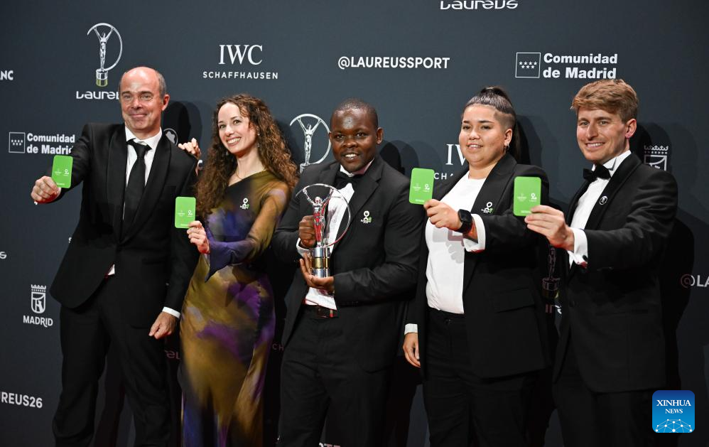 Members of Futbol Mas pose on the red carpet after winning the Sport for Good Award during the 2026 Laureus World Sports Awards ceremony in Madrid, Spain, April 20, 2026. (Xinhua/Cheng Min)