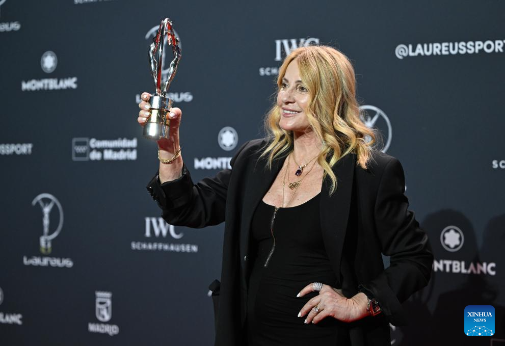 Nadia Comaneci poses with Laureus Lifetime Achievement Award during the 2026 Laureus World Sports Awards ceremony in Madrid, Spain, April 20, 2026. (Xinhua/Cheng Min)