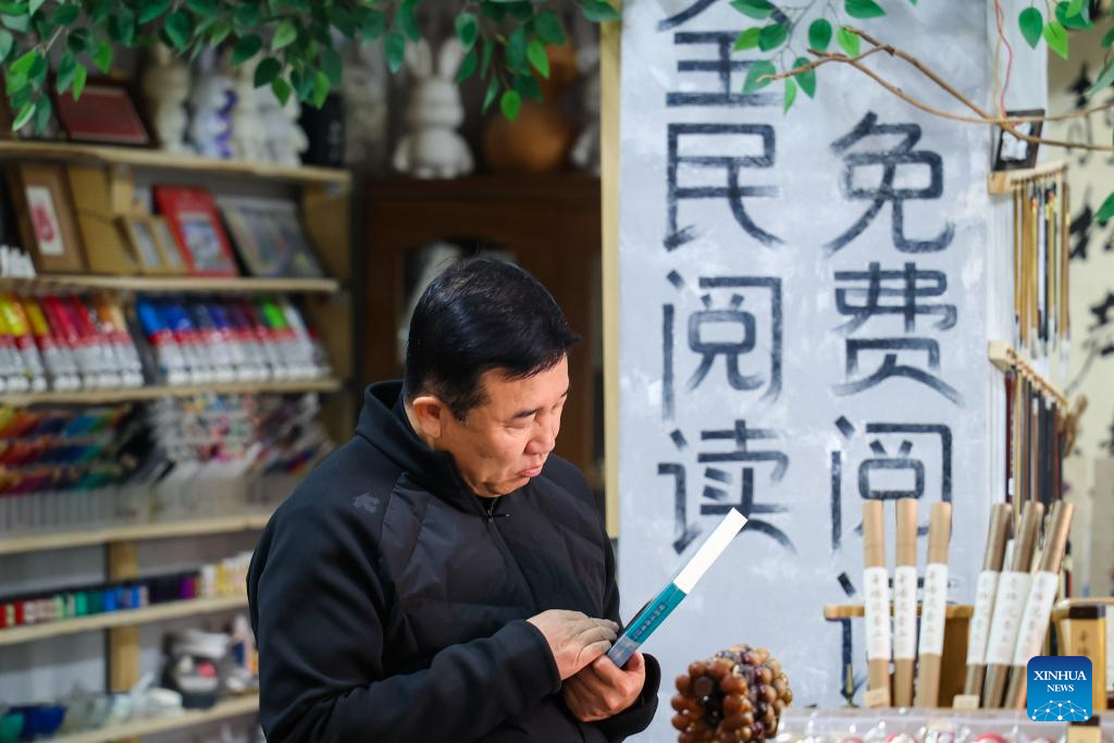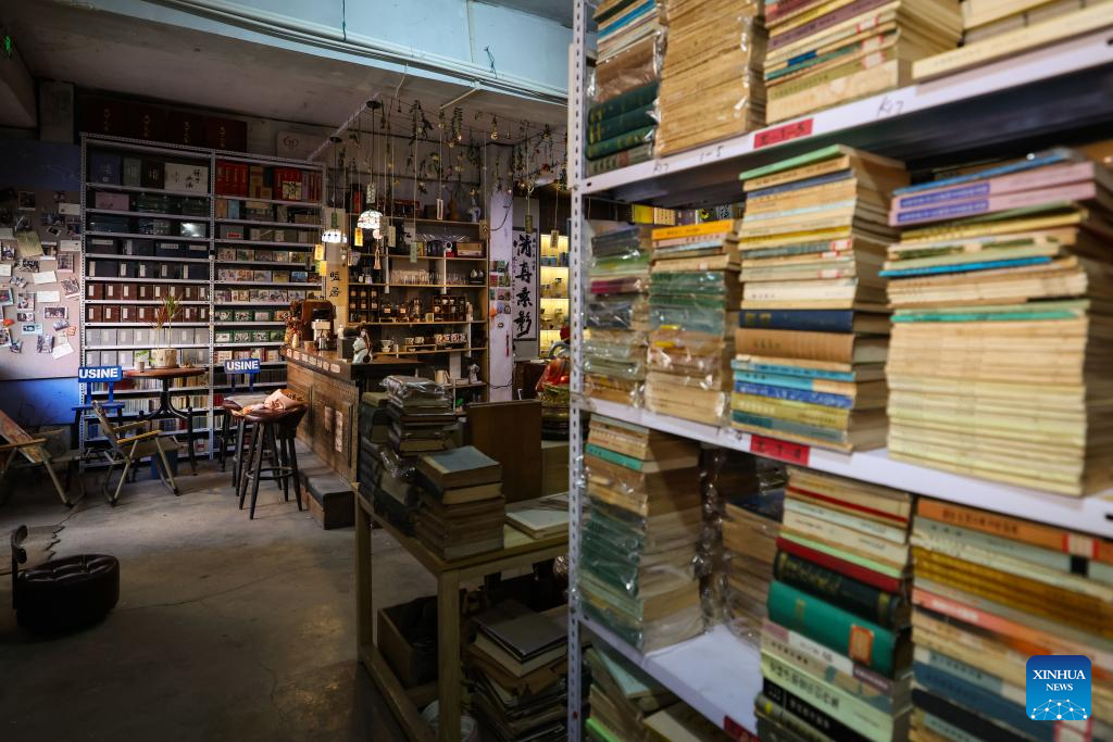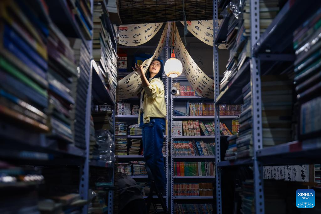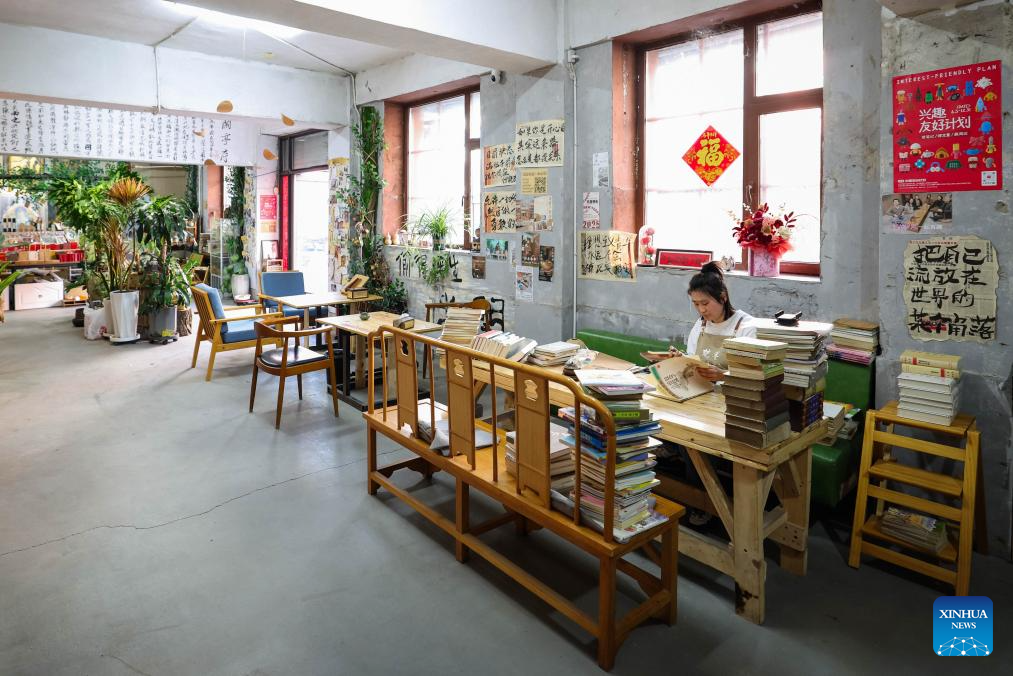 Ma Ruofan arranges decorations at Fanmo Bookstore in Changchun, northeast China's Jilin Province, April 15, 2026. Fanmo Bookstore, a second-hand book store, lies in an alley of an old residential area in Changchun. Spanning 400 square meters, it houses more than 100,000 books. Most of its space is given to books, with just over a dozen seats set aside for free reading.