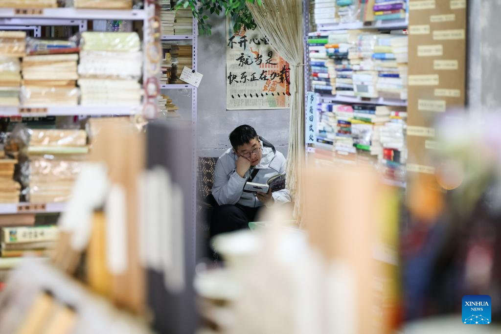 A book lover reads a book at Fanmo Bookstore in Changchun, northeast China's Jilin Province, April 15, 2026. Fanmo Bookstore, a second-hand book store, lies in an alley of an old residential area in Changchun. Spanning 400 square meters, it houses more than 100,000 books. Most of its space is given to books, with just over a dozen seats set aside for free reading.