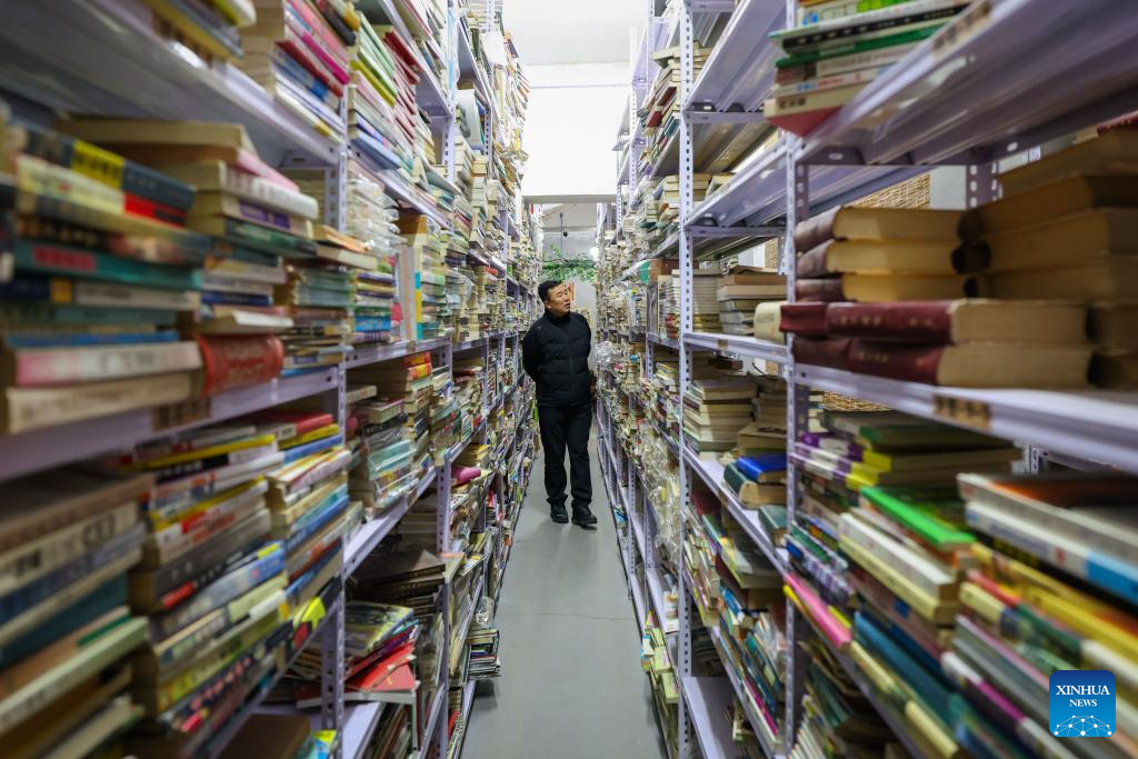 Wang Chao, a book lover and a volunteer, arranges books at Fanmo Bookstore in Changchun, northeast China's Jilin Province, April 15, 2026. Fanmo Bookstore, a second-hand book store, lies in an alley of an old residential area in Changchun. Spanning 400 square meters, it houses more than 100,000 books. Most of its space is given to books, with just over a dozen seats set aside for free reading.
