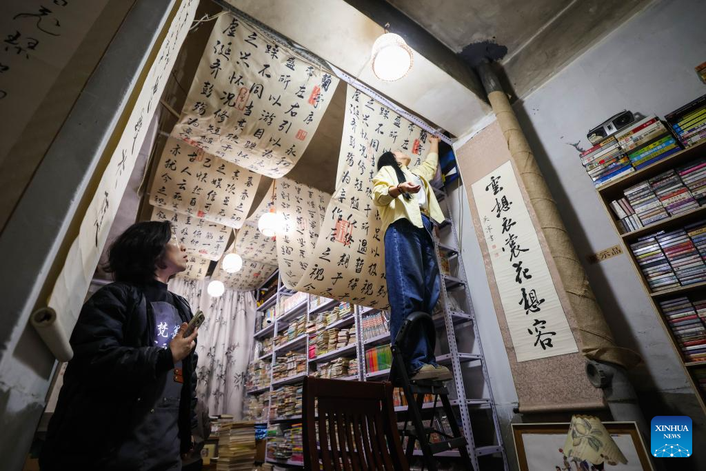 Ma Ruofan (R) arranges decorations at Fanmo Bookstore in Changchun, northeast China's Jilin Province, April 15, 2026. Fanmo Bookstore, a second-hand book store, lies in an alley of an old residential area in Changchun. Spanning 400 square meters, it houses more than 100,000 books. Most of its space is given to books, with just over a dozen seats set aside for free reading.