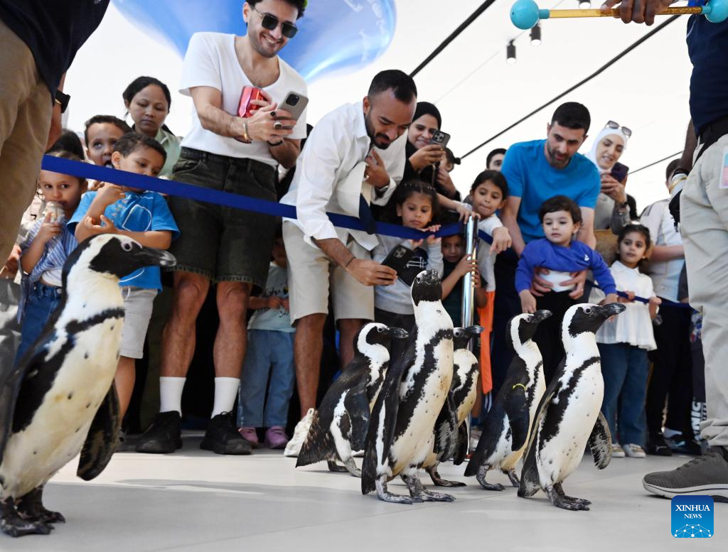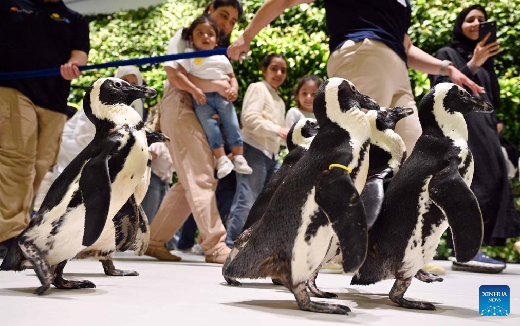 Penguins are pictured during a Penguin Walk interactive activity at the Scientific Center in Hawalli Governorate, Kuwait, April 21, 2026. The Scientific Center of Kuwait has recently launched a Penguin Walk interactive program, allowing visitors to observe penguins up close under staff supervision while learning about their habits and marine conservation. (Photo by Asad/Xinhua)