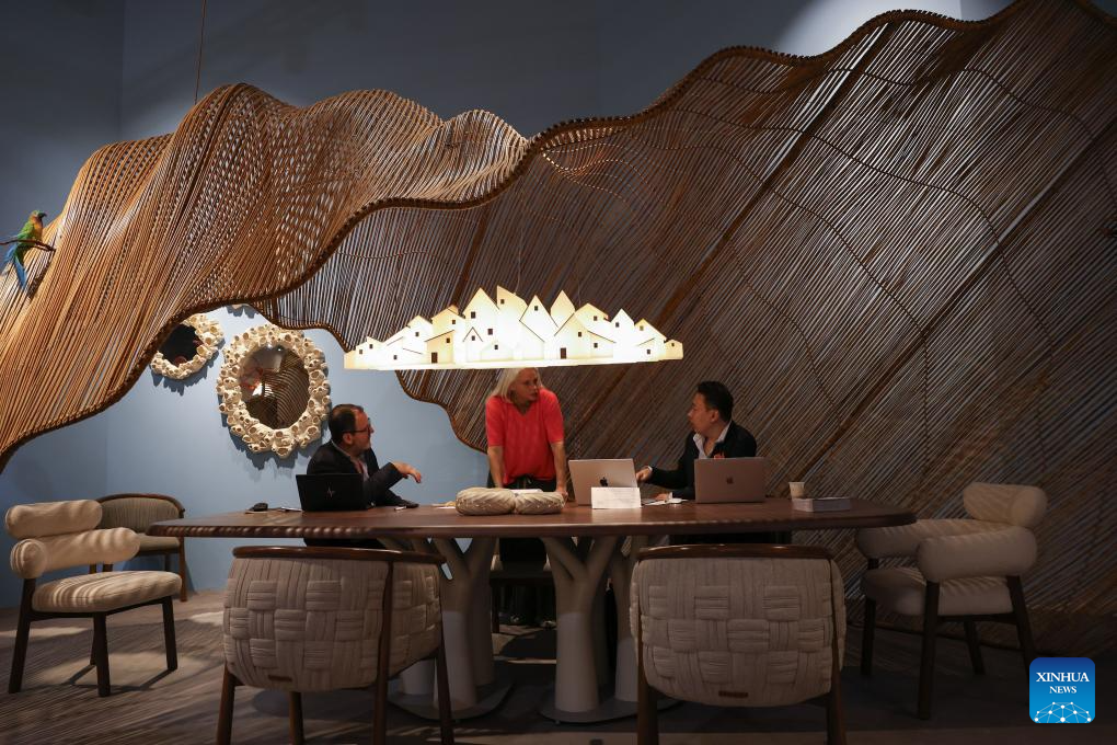 Exhibitors negotiate during the 64th Salone del Mobile at Fiera Milano Rho exhibition center in Milan, Italy, April 21, 2026. (Xinhua/Li Jing)