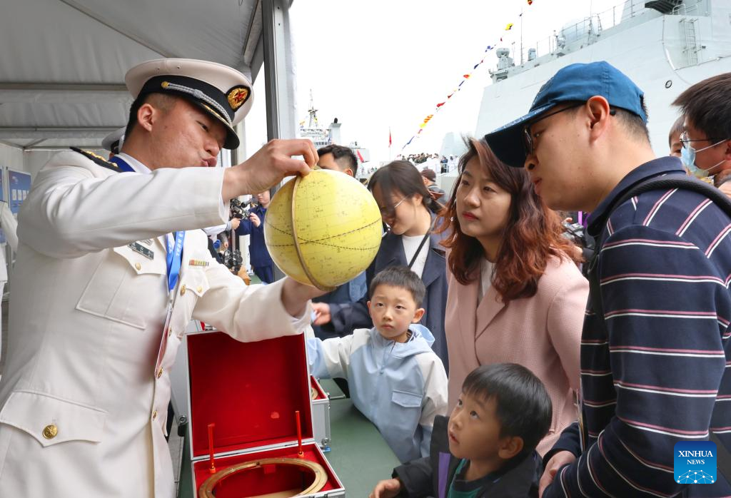 People attend an open-ship event in east China's Shanghai, April 21, 2026. The Chinese People's Liberation Army (PLA) Navy opened its barracks to the public in Shanghai on Tuesday, marking its 77th anniversary, with active-duty vessels set for public visits. (Xinhua/Fang Zhe)