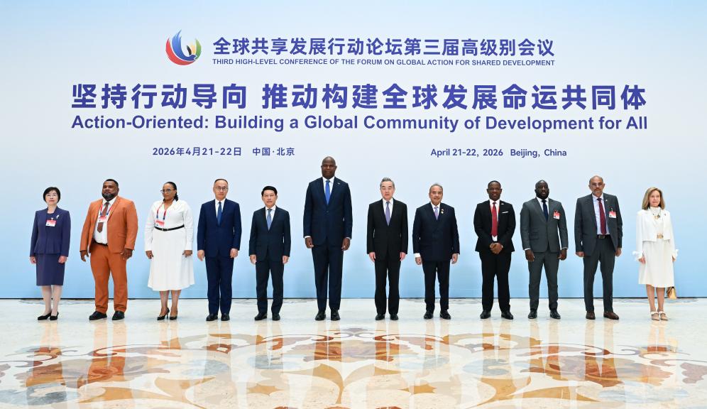 Wang Yi, a member of the Political Bureau of the Communist Party of China Central Committee and director of the Office of the Central Commission for Foreign Affairs, poses for a group photo with guests during the Third High-Level Conference of the Forum on Global Action for Shared Development in Beijing, capital of China, April 22, 2026. (Xinhua/Dai Tianfang)