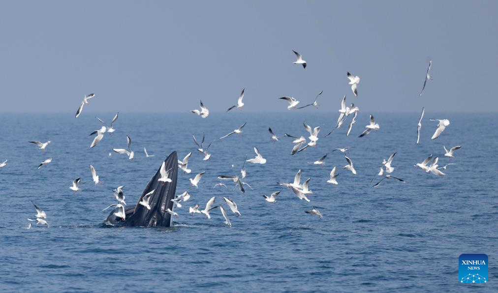 A Bryde's whale is spotted off Weizhou Island in Beihai City, south China's Guangxi Zhuang Autonomous Region, Jan. 14, 2026. (Guangxi Academy of Sciences/Handout via Xinhua)