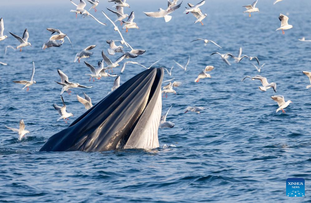 A Bryde's whale is spotted off Weizhou Island in Beihai City, south China's Guangxi Zhuang Autonomous Region, Jan. 13, 2026. (Guangxi Academy of Sciences/Handout via Xinhua)