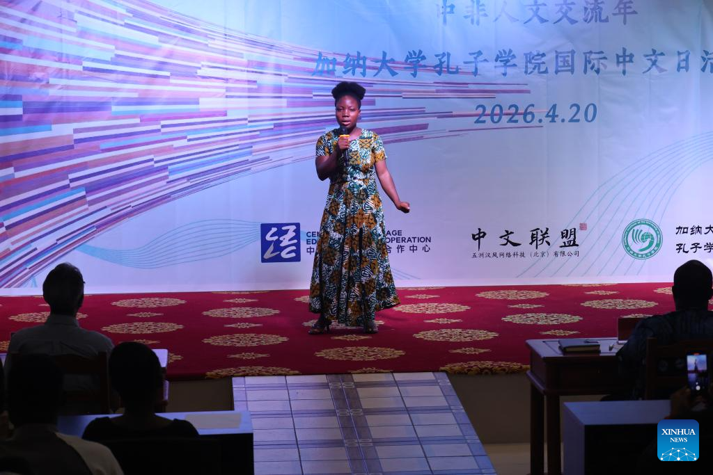 A student sings a Chinese song during a celebration event marking International Chinese Language Day, held by the Confucius Institute at the University of Ghana (CIUG), in Accra, Ghana, on April 20, 2026. (Photo by Seth/Xinhua)