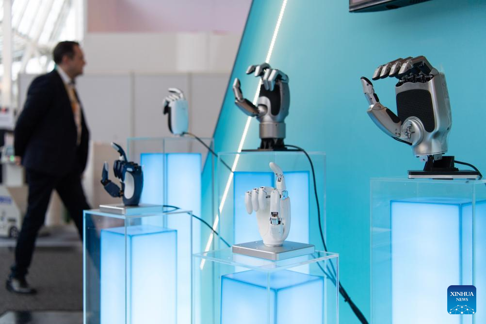 Robotic hands are pictured at the exhibition area of Linkerbot at the Hannover Messe 2026 in Hannover, Germany, April 20, 2026.