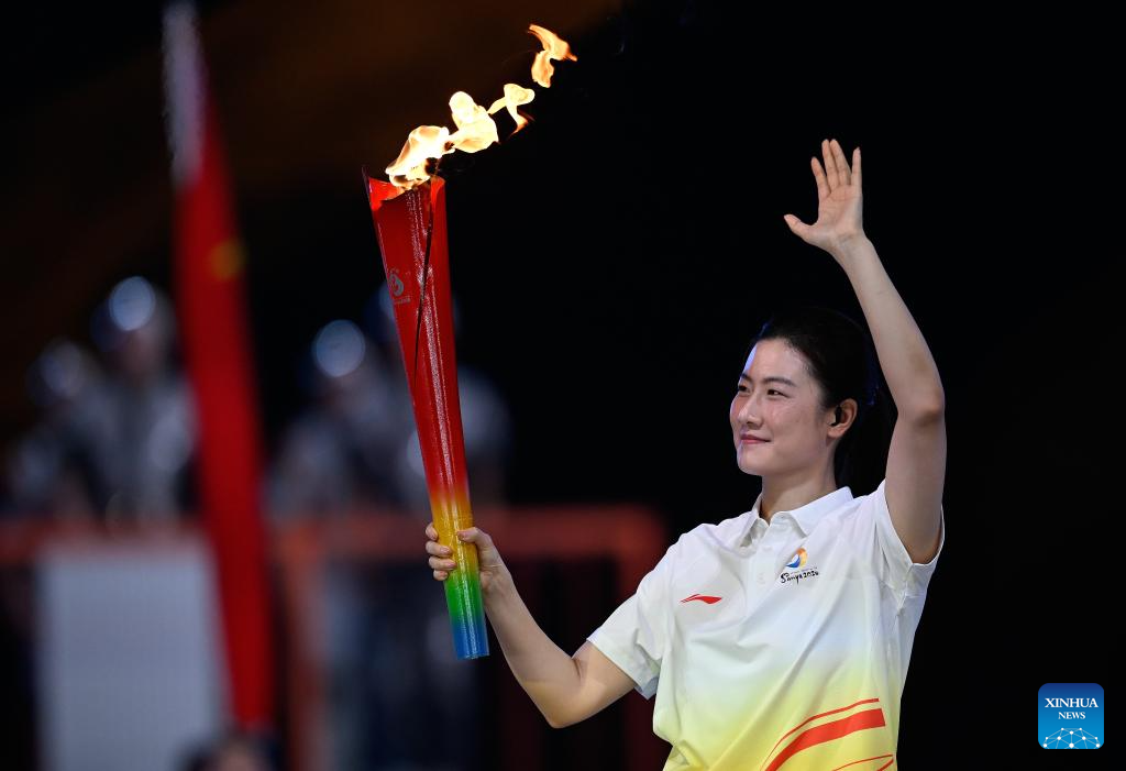 Torchbearer Ding Ning waves during the opening ceremony of the 6th Asian Beach Games in Sanya, south China's Hainan Province, April 22, 2026. (Xinhua/Zhao Zishuo)