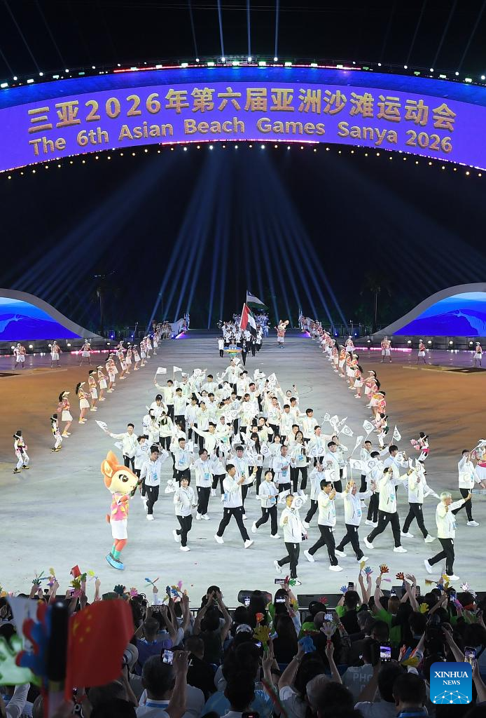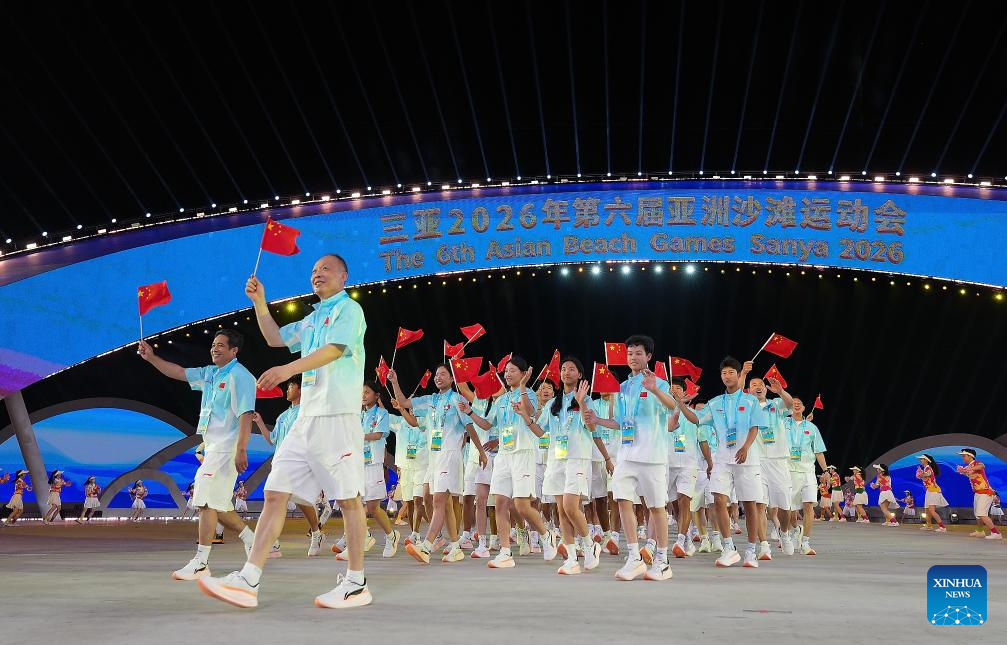 Members of the delegation of China parade during the opening ceremony of the 6th Asian Beach Games in Sanya, south China's Hainan Province, April 22, 2026. (Xinhua/Zhu Zheng)