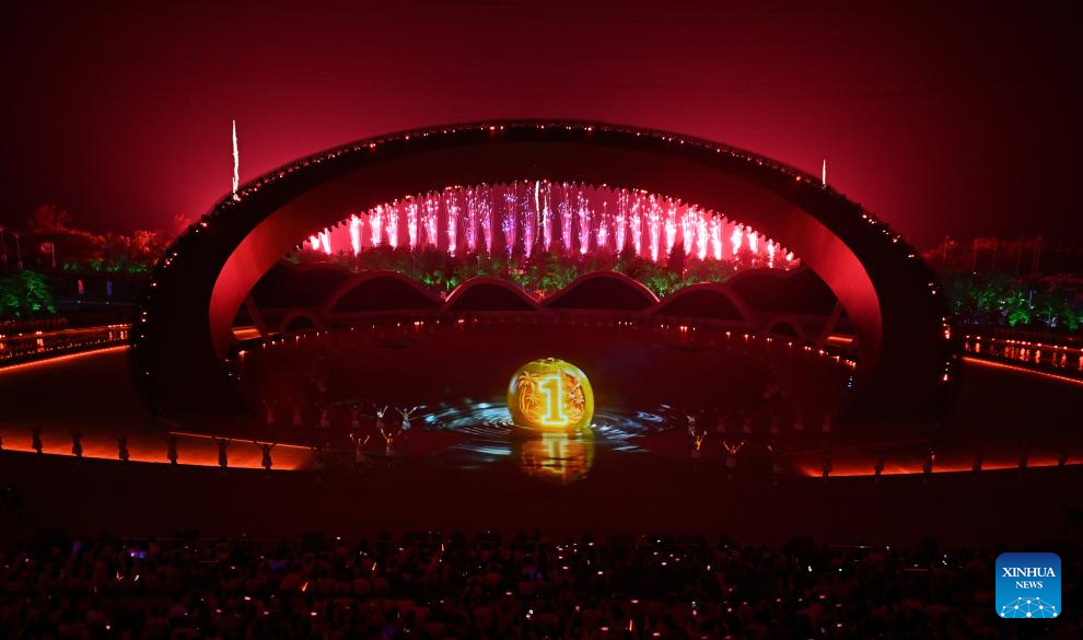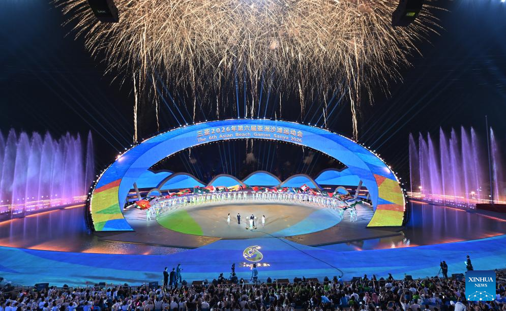 Fireworks illuminate the sky during the opening ceremony of the 6th Asian Beach Games in Sanya, south China's Hainan Province, April 22, 2026. (Xinhua/Guo Cheng)