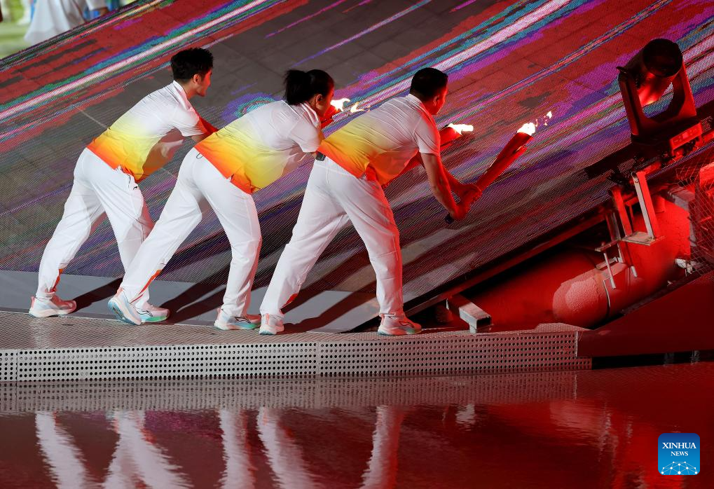 Torchbearers light the cauldron during the opening ceremony of the 6th Asian Beach Games in Sanya, south China's Hainan Province, April 22, 2026. (Xinhua/Zhu Weixi)