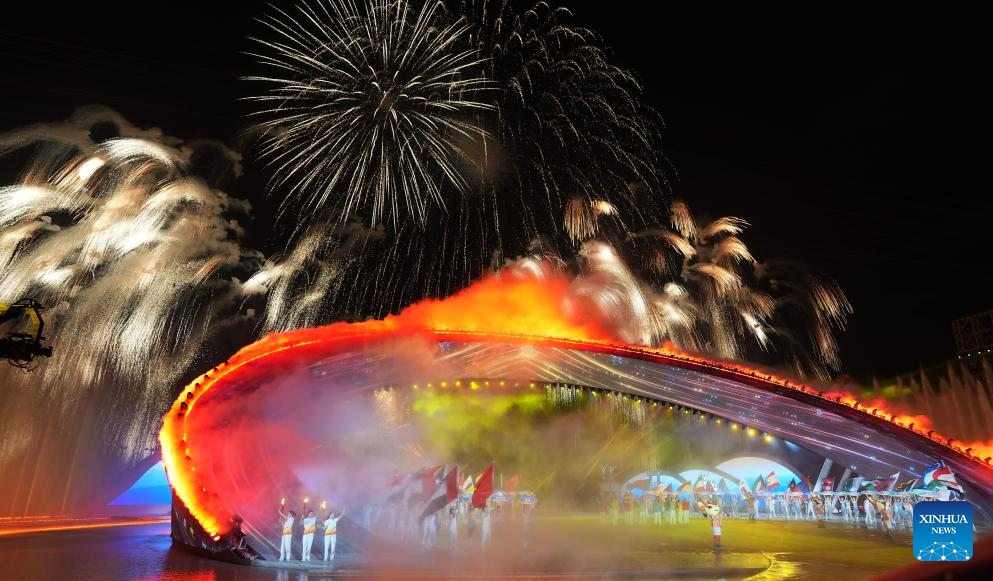 Fireworks explode during the opening ceremony of the 6th Asian Beach Games in Sanya, south China's Hainan Province, April 22, 2026. (Xinhua/Guo Cheng)