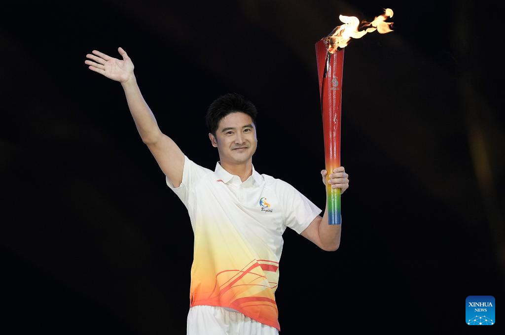 Torchbearer Tian Liang waves during the opening ceremony of the 6th Asian Beach Games in Sanya, south China's Hainan Province, April 22, 2026. (Xinhua/Zhao Zishuo)