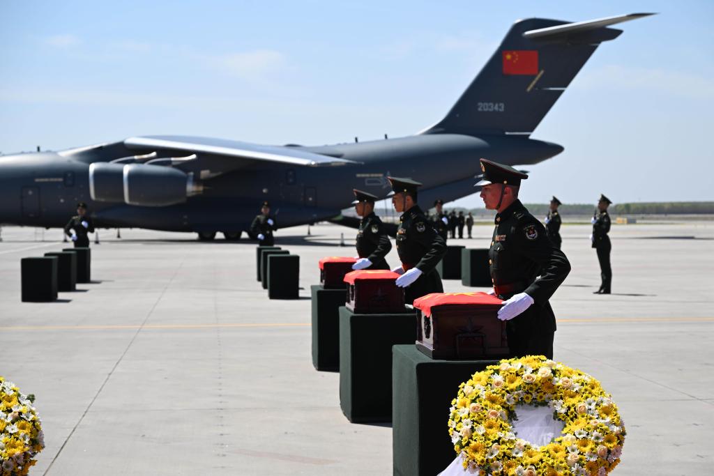 A Chinese Air Force Y-20B large transport aircraft carrying the remains of the fallen soldiers and 146 of their personal effects landed at Taoxian International Airport in Shenyang, capital of northeast China's Liaoning Province.