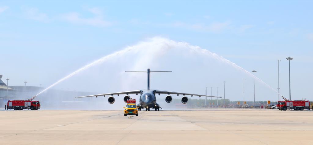 A Chinese Air Force Y-20B large transport aircraft carrying the remains of 12 Chinese People's Volunteers (CPV) martyrs is welcomed by a water cannon salute upon arrival at Taoxian International Airport in Shenyang, northeast China's Liaoning Province, April 22, 2026. The remains of 12 CPV martyrs who lost their lives during the War to Resist U.S. Aggression and Aid Korea (1950-1953) were returned to China from the Republic of Korea (ROK) on Wednesday.