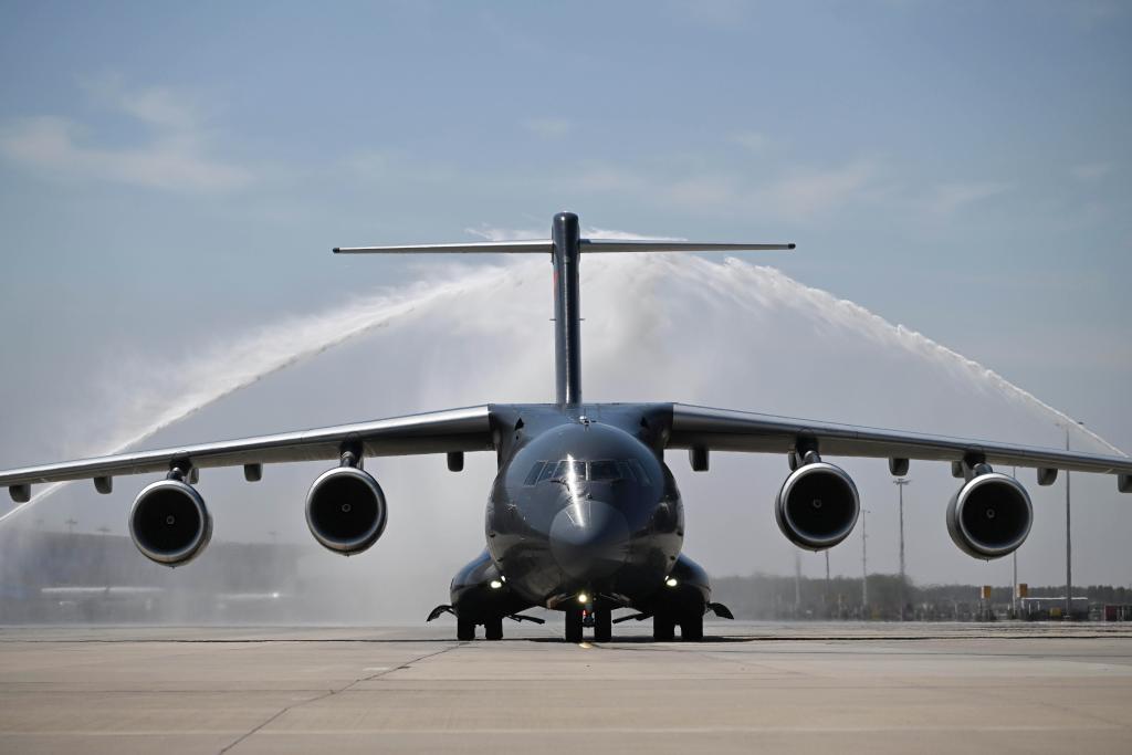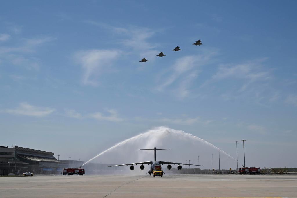 A Chinese Air Force Y-20B large transport aircraft carrying the remains of the Chinese People's Volunteers martyrs is welcomed by a water cannon salute upon arrival at Taoxian International Airport in Shenyang, northeast China's Liaoning Province, April 22, 2026. The remains of 12 Chinese People's Volunteers (CPV) martyrs who lost their lives during the War to Resist U.S. Aggression and Aid Korea (1950-1953) were returned to China from the Republic of Korea (ROK) on Wednesday.