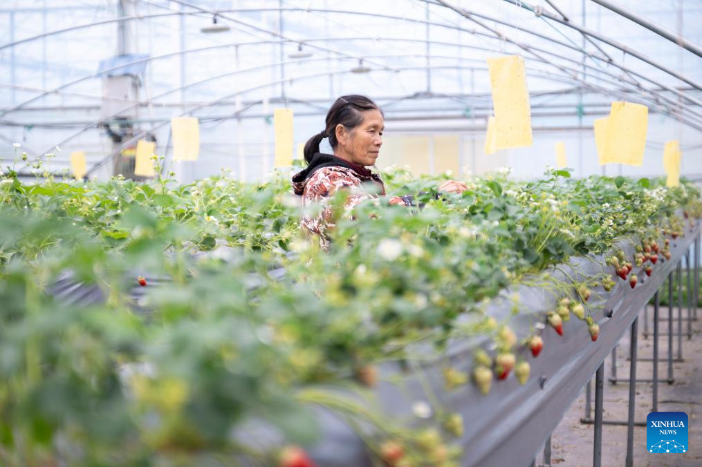 A worker picks strawberries at Kuo Yang-fu's farming complex in Ezhou, central China's Hubei Province, March 18, 2026. (Xinhua/Wu Zhizun)