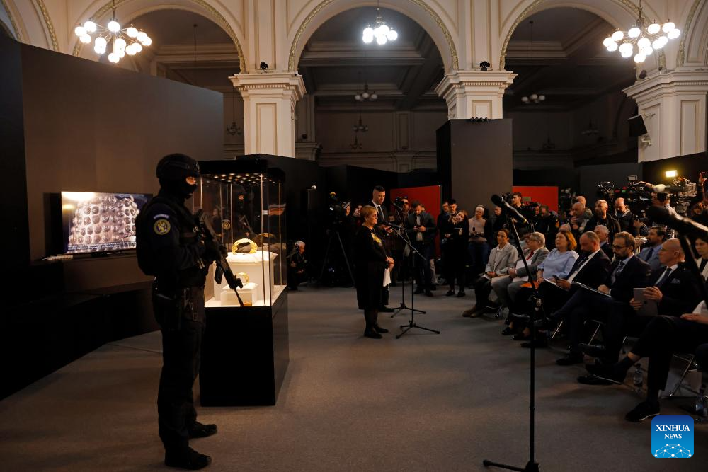 A 2,500-year-old helmet and two bracelets of the ancient Dacian culture are displayed at Romania's National History Museum in Bucharest, Romania, April 21, 2026. The helmet and two bracelets were recovered after being stolen from a museum in the Netherlands and now returned to Romania. (Photo by Cristian Cristel/Xinhua)