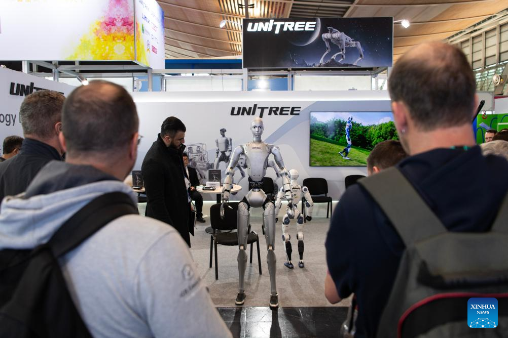 People visit the exhibition area of Unitree Robotics at the Hannover Messe 2026 in Hannover, Germany, April 20, 2026. Hannover Messe 2026, Germany's flagship industrial trade fair, opened on Monday with industrial artificial intelligence (AI) and humanoid robots taking center stage for the first time.