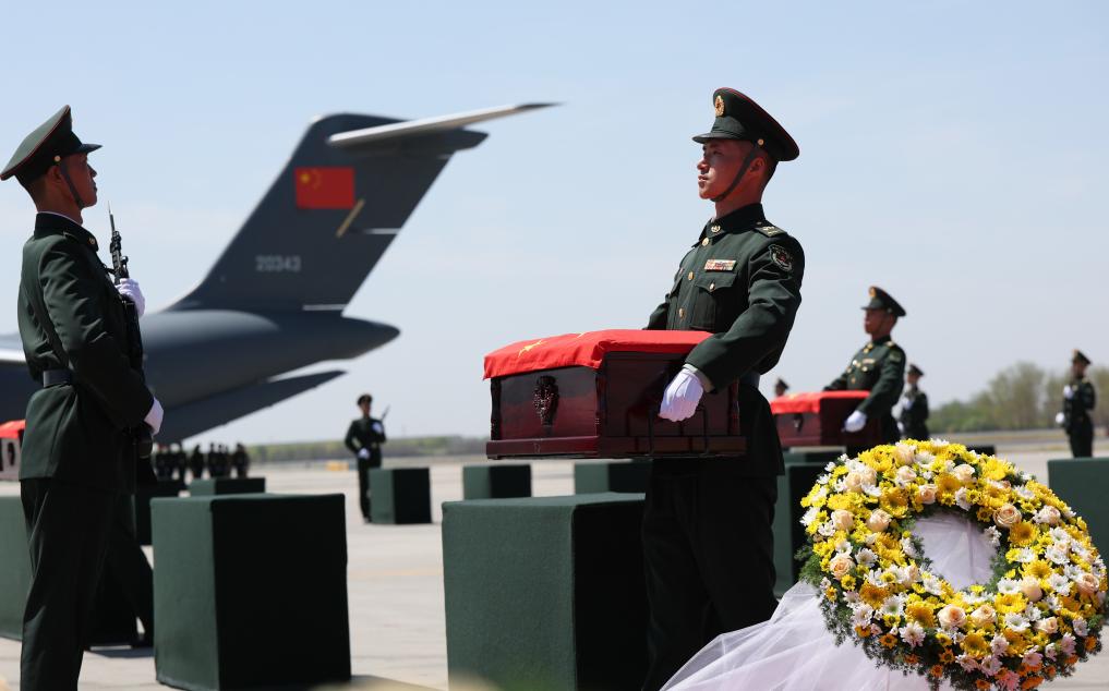Honor guards escort coffins containing the remains of the Chinese People's Volunteers martyrs at Taoxian International Airport in Shenyang, northeast China's Liaoning Province, April 22, 2026. The remains of 12 Chinese People's Volunteers (CPV) martyrs who lost their lives during the War to Resist U.S. Aggression and Aid Korea (1950-1953) were returned to China from the Republic of Korea (ROK) on Wednesday.