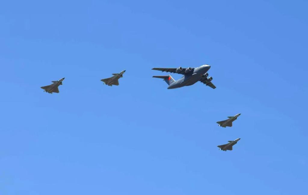 A Chinese Air Force Y-20B large transport aircraft carrying the remains of the fallen soldiers, escorted by four J-20 fighter jets, is pictured in Shenyang, northeast China's Liaoning Province, April 22, 2026. The remains of 12 Chinese People's Volunteers (CPV) martyrs who lost their lives during the War to Resist U.S. Aggression and Aid Korea (1950-1953) were returned to China from the Republic of Korea (ROK) on Wednesday.