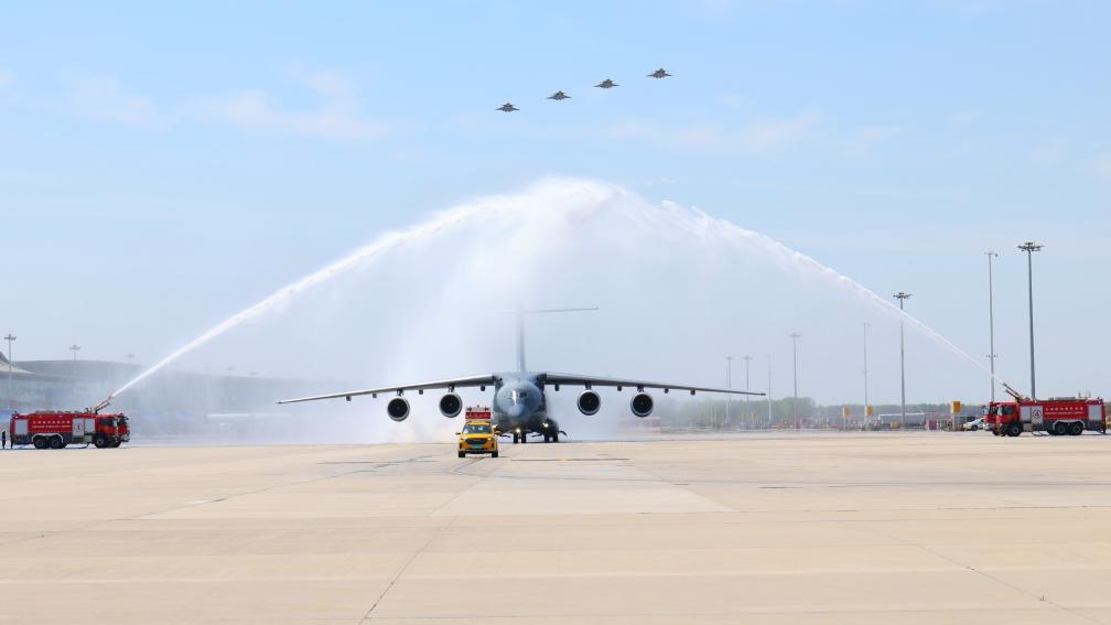 A Chinese Air Force Y-20B large transport aircraft carrying the remains of the Chinese People's Volunteers martyrs is welcomed by a water cannon salute upon arrival at Taoxian International Airport in Shenyang, northeast China's Liaoning Province, April 22, 2026. The remains of 12 Chinese People's Volunteers (CPV) martyrs who lost their lives during the War to Resist U.S. Aggression and Aid Korea (1950-1953) were returned to China from the Republic of Korea (ROK) on Wednesday.