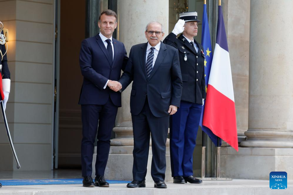 French President Emmanuel Macron (L, front) greets visiting Lebanese Prime Minister Nawaf Salam (R, front) at Elysee Palace in Paris, France, April 21, 2026. French President Emmanuel Macron said Tuesday that Israel must "renounce its territorial ambitions" in Lebanon, calling for a political settlement to ensure regional stability. (Photo by Henri Szwarc/Xinhua)