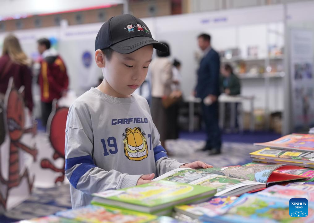 A boy browses a book during the Eurasian Book Fair in Astana, Kazakhstan, April 22, 2026. This event is held here from April 22 to 26. (Photo by Kalizhan Ospanov/Xinhua)